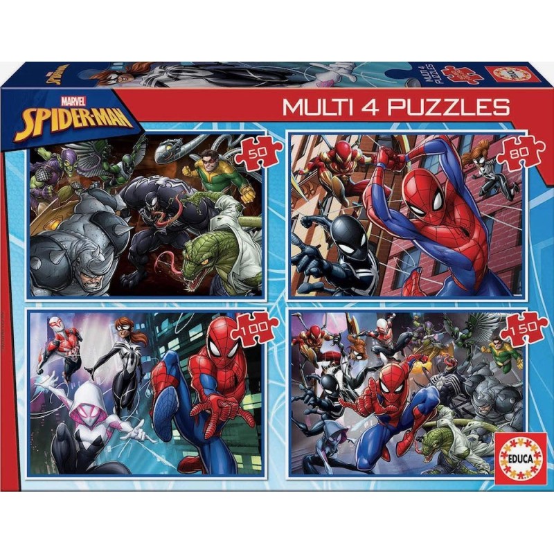 Multi 4 Puzzles Junior con diferente número de piezas (50-80-100-150 piezas) para que niños y niñas se atrevan con distintos niveles de dificultad a medida que crecen y ganan práctica en el montaje. Puzzles inspirados en Ultimate Spider-Man. Compuestos por grandes piezas, óptimo acabadas para que sea sencilla y segura su manipulación por los niños. Los puzzle estimulan la fijación de la atención así como el desarrollo de la psicomotricidad, la curiosidad e imaginación de los pequeños.