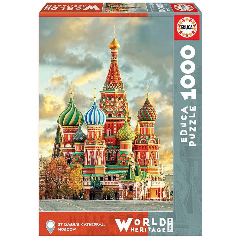 Puzzle de 1000, Catedral De San Basilio, Moscú. Grandiosa vista de la famosa catedral moscovita. Puzzle de la colección World Heritage de Educa, con las imágenes más cautivadores de nuestro planeta. Dimensiones aproximadas del puzzle montado: 68 x 48 cm. Incluye Fix Puzzle, para pegar el puzzle una vez montado.