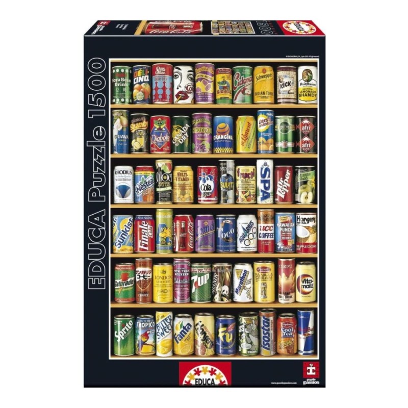 Puzzle de 1500 piezas con un diseño de una colección de latas de refrescos Educa te ofrece la colección de Puzzles Adultos más completa del mercado, con tamaños desde las 500 a las 33600 piezas y con las mejores imágenes y los personajes más divertidos. Medidas del puzzle aproximado: 85 x 60 cm. Número de piezas: 1500. Edad recomendada: a partir de 12 años.