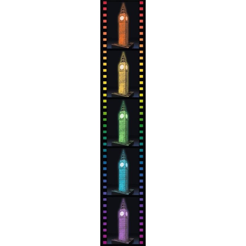 Puzzle 3D del Big Benl, Night Edition, con luz LED. ¡El famoso Big Ben de Londres se convierte en un puzle 3D que se ilumina en la oscuridad! ¡Gracias a la luz LED tu construcción se ilumina con colores hermosos y brillantes! 216 piezas. Edad recomendada: a partir de 8 años.