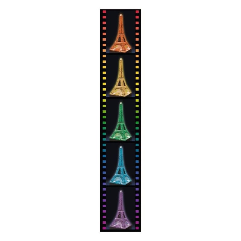 Puzzle 3D, Tour Eiffel Night Edition, con luz LED. ¡La famosa Tour Eiffel de París se convierte en un puzle 3D que se ilumina en la oscuridad! ¡Gracias a la luz LED tu construcción se ilumina con colores hermosos y brillantes! 216 piezas. Edad recomendada: a partir de 10 años.