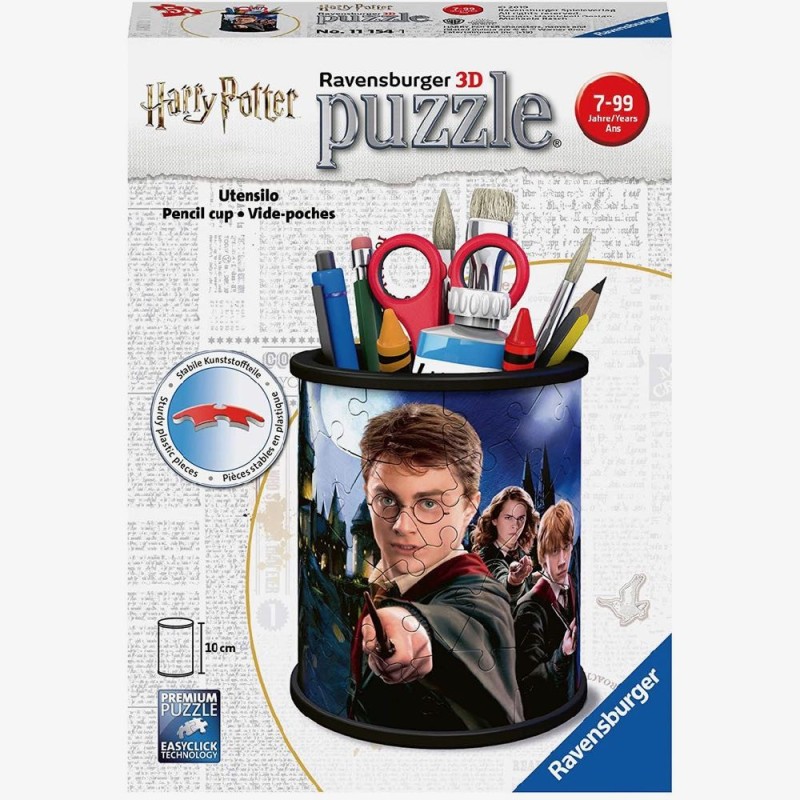 Puzzle 3D Portalápices Harry Potter. Piezas de plástico de alta calidad y con un ensamble perfecto, para crear un maravilloso portalápiz de Harry Potter. El resultado final es un elemento único, decorativo, tanto para una casa como para una oficina. Contiene 54 piezas numeradas e instrucciones. Edad recomendada: +7 años.