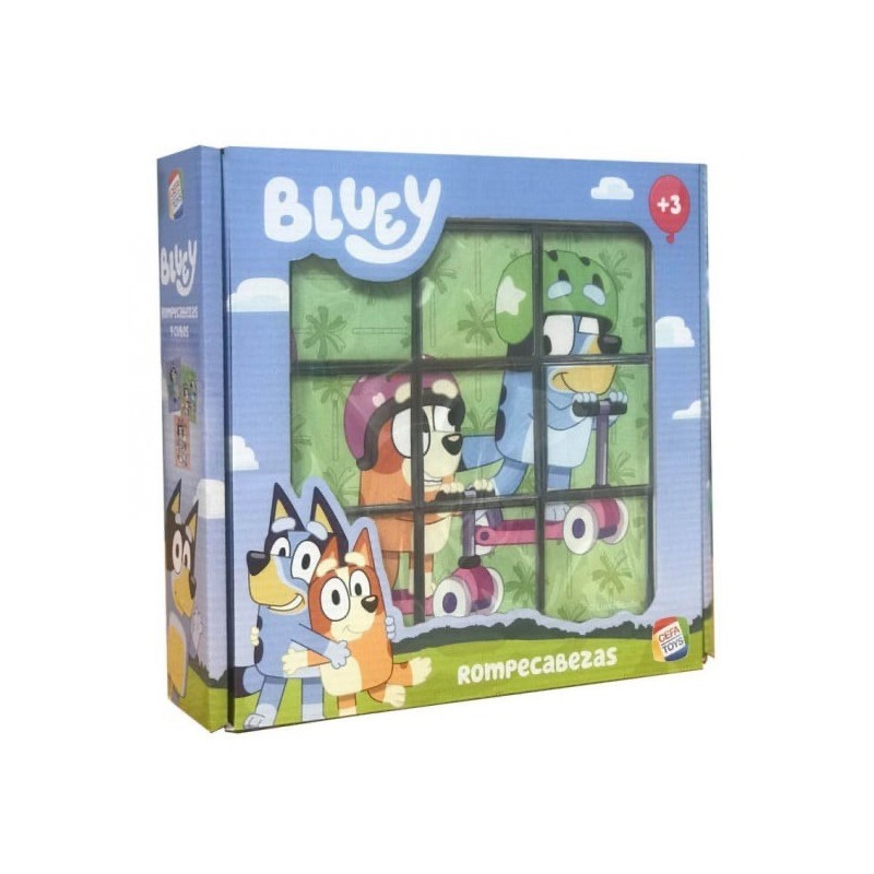 Medidas: 21 X 22 X 6 cm. Edad recomendada: +3 años. Rompecabezas de 9 cubos con las imágenes de la serie Bluey 2. Incluye 6 imágenes de la serie para que el niño pueda montar su personaje favorito. Este producto está fabricado en España.