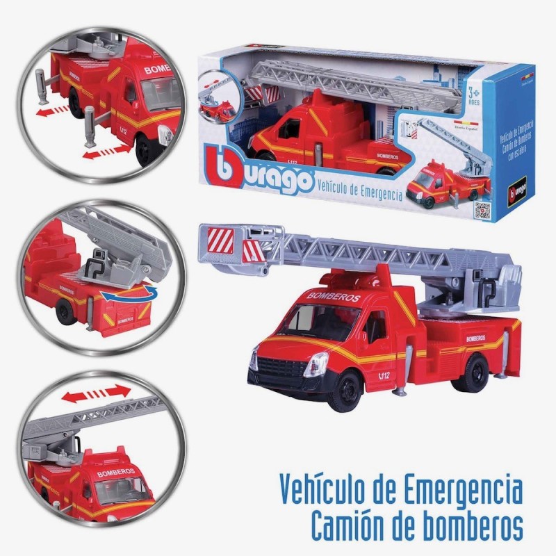 Camión de bomberos con escalera en miniatura. Réplica realista a pequeña escala del vehículo de emergencias con todo tipo de detalles. Con escalera incluida que se mueve: sube, baja y gira. Siempre con la gran calidad de Bburago, fabricado en die cast con partes de plástico. Colecciona los vehículos de emergencia (bomberos y ambulancia) y los cuerpos de Seguridad Pública de la Guardia Civil con su moto y coche.