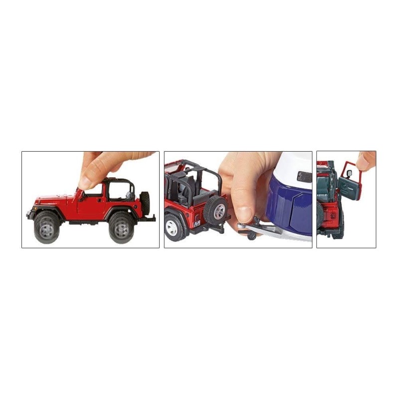 Jeep Wrangler. Escala 1:32. Dimensiones: 130x61x58 mm. Los ejes están equipados con muelles. Se pueden abrir las puertas y el capó del motor. El modelo se puede dirigir a través del volante. Edad recomendada: +3 años.