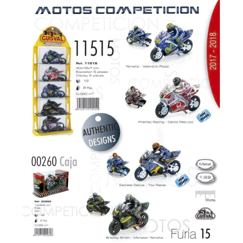 Pack 5 unidades. Motos competición de la marca Guisval. Colección de motos de competición con réplicas de motos de pilotos del mundial de velocidad. Las motos miden unos 10 cm de largo. Fabricadas en España. Edad recomendada: a partir de 3 años.