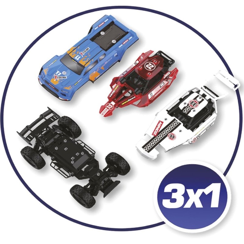 Edad recomendada: +8 años. 1 coche con 3 carrocerías, monta el coche sin herramientas y después pilota. Incluye más de 100 piezas, para poder montar el vehículo, solo debes elegir una de las 3 carrocerías que lleva este Set. Una vez montado, podrás jugar con este coche de Radio Control con su emisora de 2.4 Ghz que alcanza velocidades de hasta 8 Km/h. La interacción entre pequeños y grandes hacen aún más atractivo este coche teledirigido. Este producto STREAM es la óptima manera para aprender mecánica sin necesidad de herramientas, con él, los pequeños/as desarrollaran sus habilidades y estimularan la mente y el ingenio.