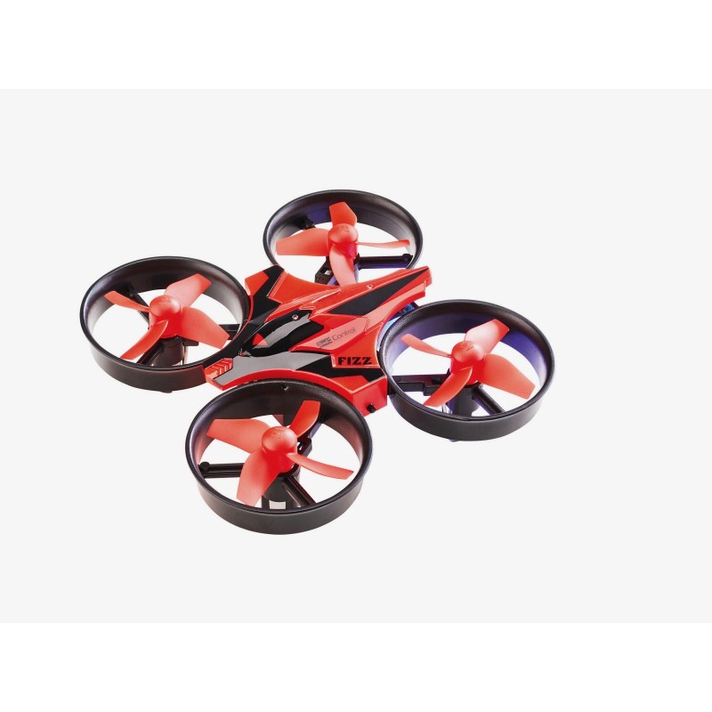 Edad recomendada: +8 años. Longitud: 85 mm Tiempo de funcionamiento: 6 Min. Sistema de radio: GHz El pequeño cuadricóptero GHz Fizz se puede controlar perfectamente en casa y en la oficina gracias a su reducido tamaño y a los resistentes anillos protectores de los rotores. Con tres velocidades y el modo sin cabeza, es ideal tanto para principiantes a partir de 8 años como para pilotos experimentados. La función de volteo garantiza giros espectaculares en espacios reducidos. Requiere 3 pilas AAA de 1,5 V (no incluidas). Contiene: 1 x modelo, 1 transmisor de GHz,1 x cargador USB, 1 x batería, 1 x juego de rotor de repuesto, instrucciones.