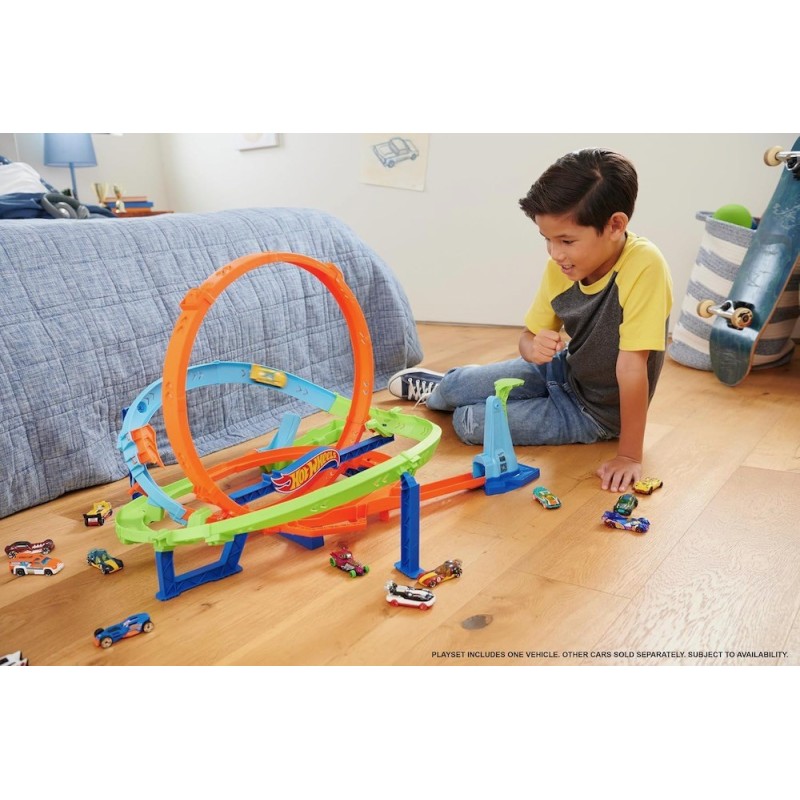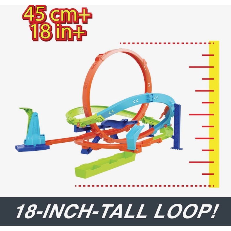 77,47 x 67,56 x 47,75 cm Con el Hot Wheels Action Trackset Looping Cyclone Challenge, las carreras y las acrobacias se llevan a un nuevo nivel. Este juego dinámico ofrece dos posibilidades de juego: el bucle de boomerang para varias rondas de carreras o el salto para lograr tantos puntos como sea posible. En ambas opciones, los autos se envían a través de bucles legendarios y curvas que proporcionan una velocidad impresionante. El juego se pliega para un almacenamiento fácil y práctico y viene con 1 vehículo Hot Wheels a escala 1:64.