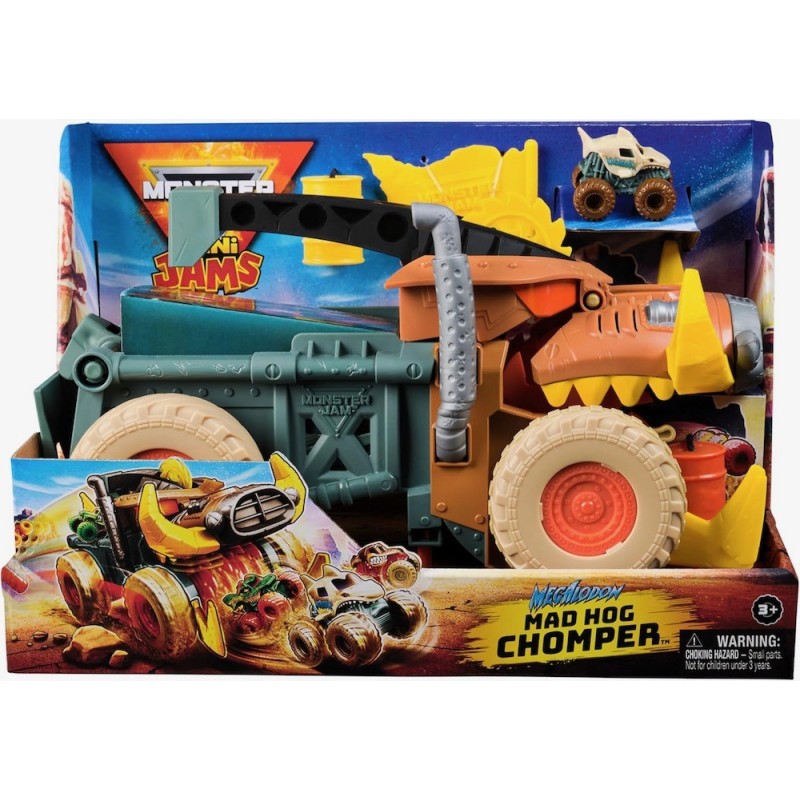 ¡Juega con más emoción que nunca con los camiones de Monster Jam Estos camiones combinan la fuerza y el rendimiento de los Monster Trucks para ofrecer una experiencia de juego llena de acción y acrobacias imposibles. PASA A LA ACCIÓN CON EL CAMIÓN MAD HOG CHOMPER: Déjate llevar por la emoción mientras el gigantesco Megalodon Mad Hog devora y recoge todos los camiones Mini Jams y barriles que se interpongan en su camino. INCLUYE UN CAMIÓN MEGALODON Y BARRILES: Incluye un camión Megalodon de Monster Jam Mini Jams a escala 1:87 y 2 barriles para divertirte al estilo Mad Hog.
