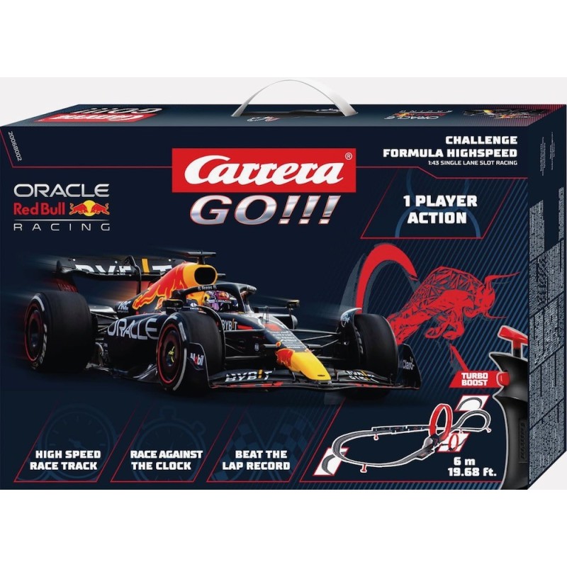 Edad recomendada: +6 años. Carrera GO!!! Pista de carreras Challenge para 1 jugador a partir de 6 años – Vehículo y rieles a escala 1:43 – Máxima velocidad gracias a la pista de alta velocidad – Tensión por Challenge Mode – Crack el récord de rondas con una duración de carrera libremente seleccionable de 30, 45 y 60 segundos por reto.