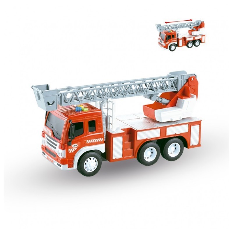 Edad recomendada: +3 años. Camión bomberos 1:16, se impulsa con fricción, pulsa para que emita sonidos y encienda luces. Escalera extensible y giratoria. Funciona con 3 pilas AG13 incluidas.