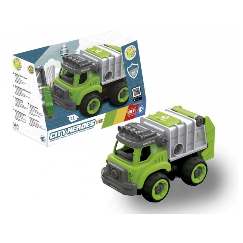 Edad recomendada: +3 años. Camión de la Basura desmontable. Compuesto por 27 piezas. Se presenta montado y con un destornillador para poder sacar, ajustar o cambiar las piezas. Presenta instrucciones de montaje y existen 4 modelos más para coleccionar. Tiene sonidos y funciona con pilas.