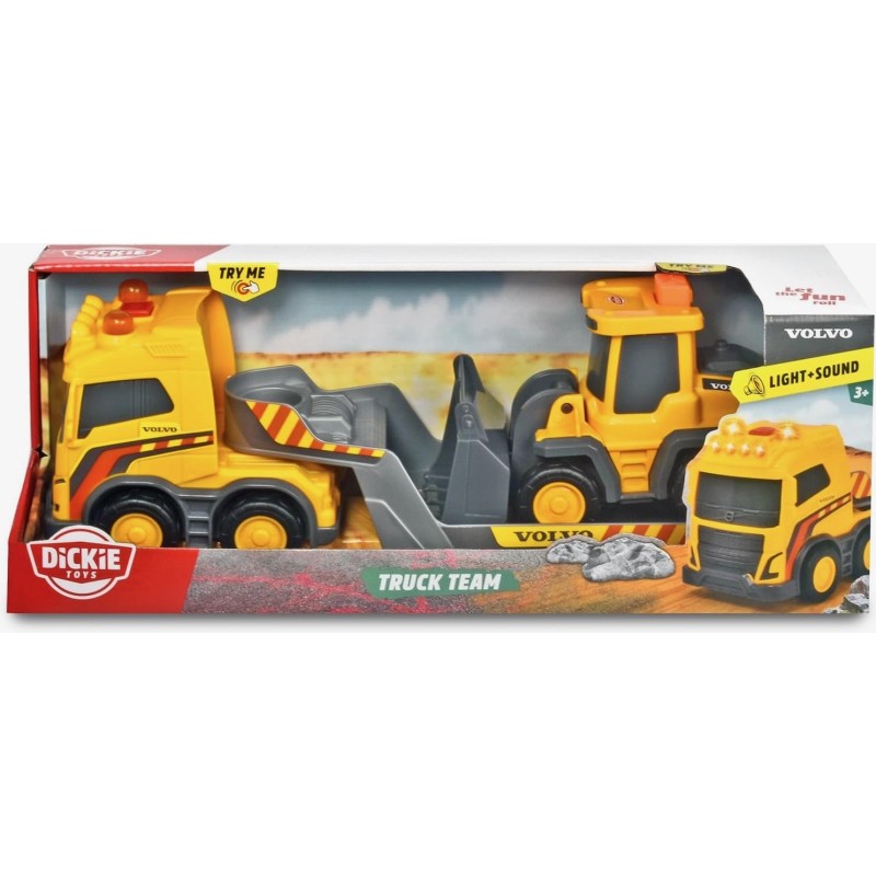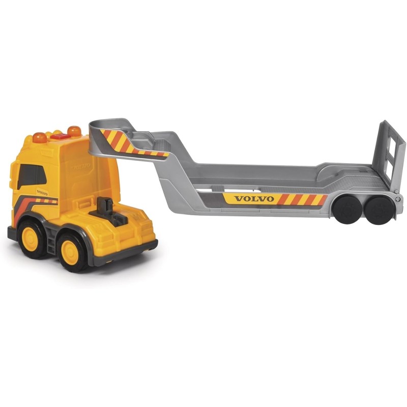 El camión de 32 cm de largo lleva una auténtica excavadora Volvo (9 cm) en su pala baja. Gracias a su rueda libre, es fácil de mover y llega con seguridad a la obra. Su pala puede moverse fácilmente hacia arriba y hacia abajo con sólo pulsar un botón, por lo que no se pierde carga. El camión tiene un remolque del que puede bajar fácilmente la excavadora. La cabina se puede separar del remolque. Para que jugar con el transporte pesado sea aún más realista y emocionante, el camión de juguete ofrece diferentes efectos de luz y sonido (incluye 2 pilas R03 de 1,5 V).